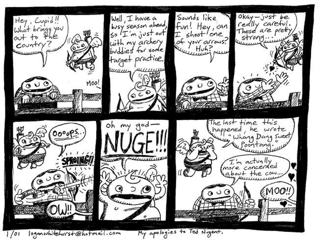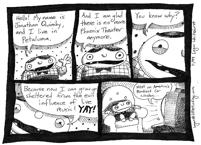 Below are some comics I drew for Section M. It was a monthly magazine, and I contributed nearly every month. The only reason this page is not complete is that I kept horrible track of my drawings and many have gone missing. Being that the magazine is about local music, most of the comics have a music-related theme. Making appearances are Tom Gaffey (operator of the Phoenix Theater in Petaluma), The Inn of the Beginning (a local music venue which closed), and Ted Nugent (not local to this area).