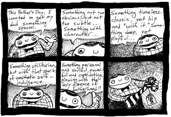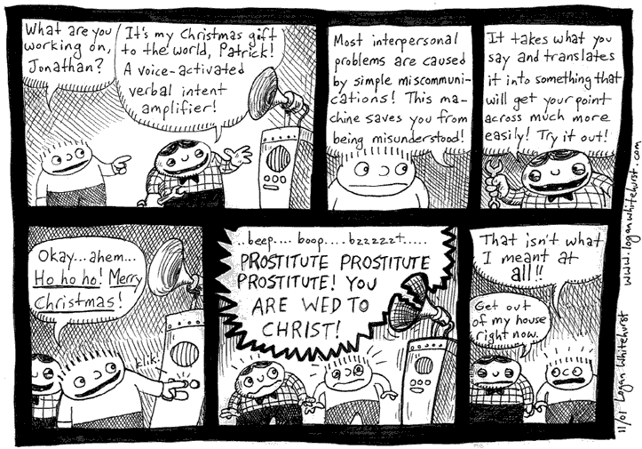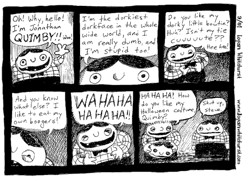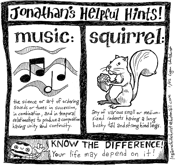 The comics originally had no constant main character, but within the first year (1999) I decided that the comics should all star Jonathan. Jonathan is alternately extremely intelligent and extremely inept. He is alternately wise and foolish. He is alternately practical and nonsensical. He is alternately mature and childlike. I have no idea how old he is supposed to be. He is whatever I feel like having him be at any given time. It makes it hard to discern his true character, but that's okay.