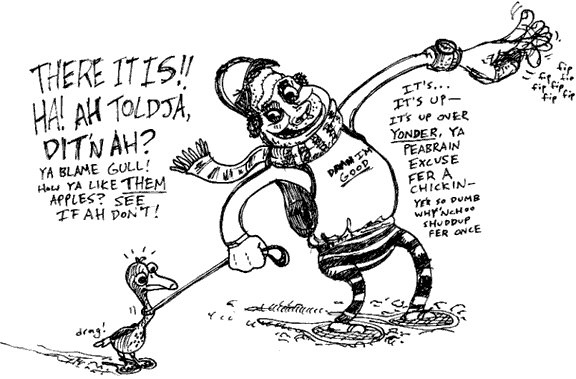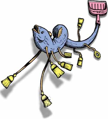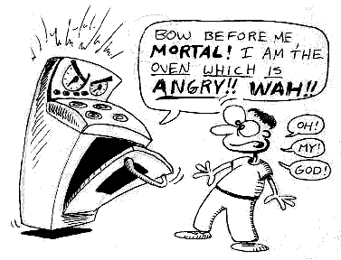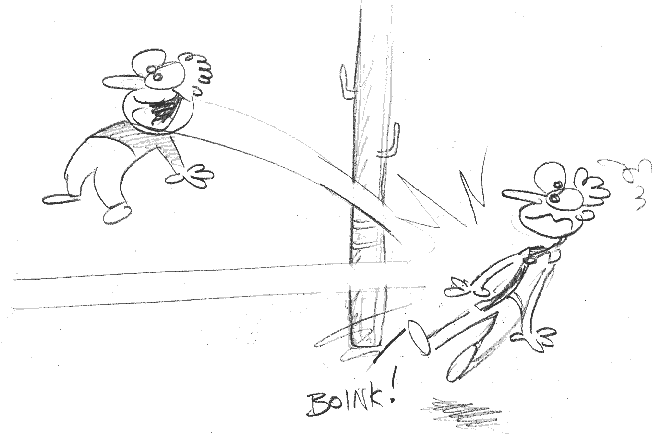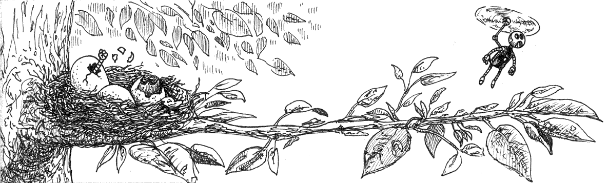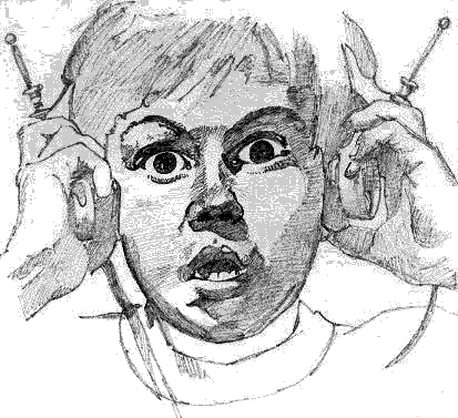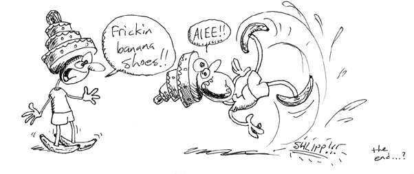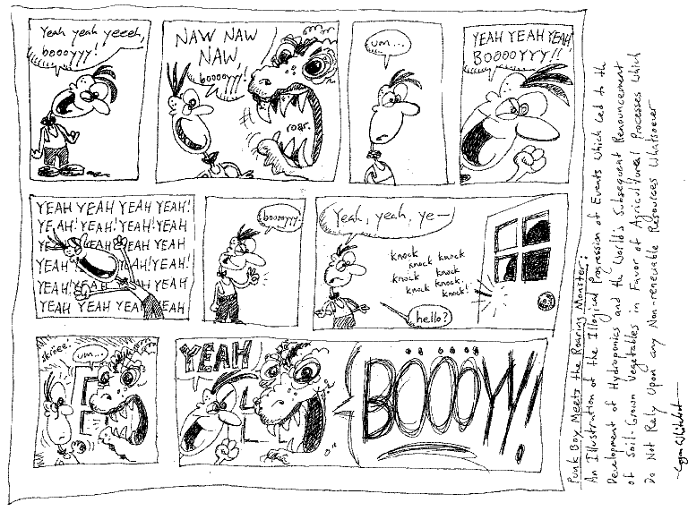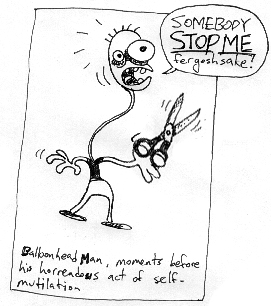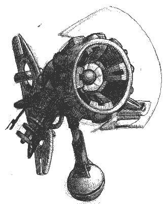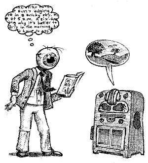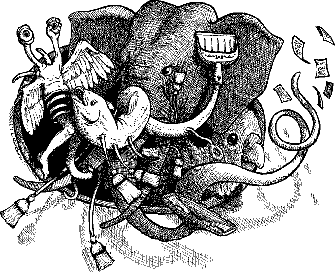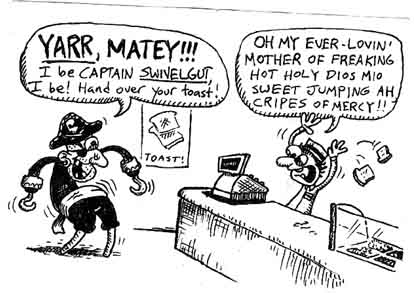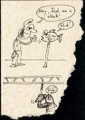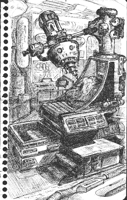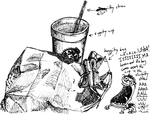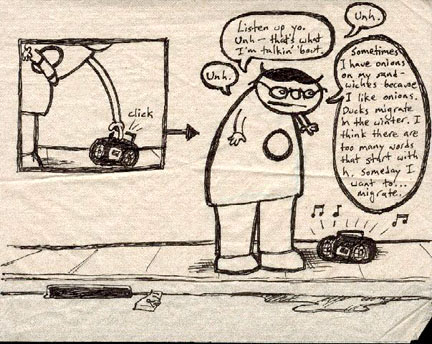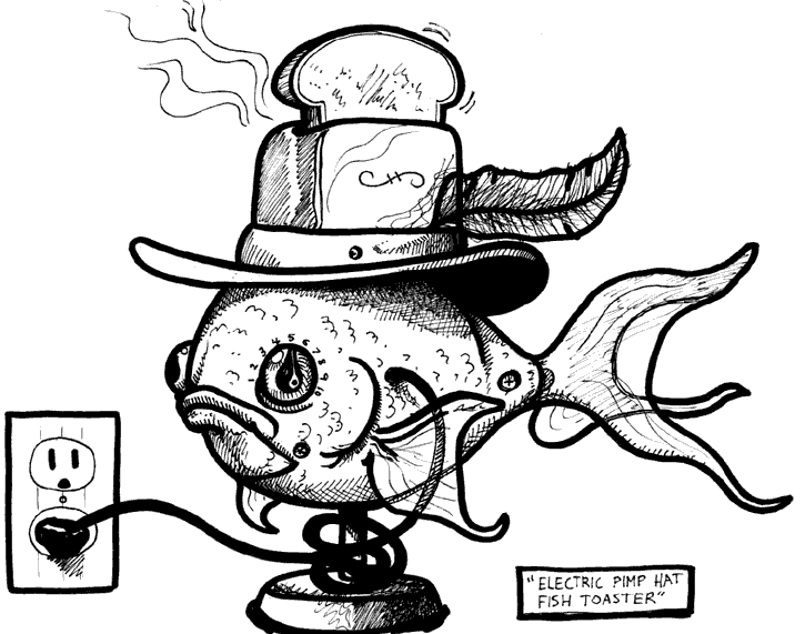 Robot Hatchlings -- (2002) Sketch done on special commission for a friend. I did this one in permanent marker on acid-free paper left over from my printmaking classes. Electric Pimp Hat Fish Toaster -- (2001) Even more of the same. I am beginning to think my ideal world would be designed entirely of strange machinery, toast, and fish. Broomfish and the Vachyderm Summarily Reject the Clubhouse Rules as Drafted by Headless Boy and the Octofinch -- (2001) black pen on printer paper. I spent an afternoon at the coffee shop making this for no reason whatsoever. I also colored it in the computer and made this version with just the Broomfish. Boy With Headphones -- (1998) ballpoint pen. From my little sketchbook, this is based on an old advertisement from the 50s--I can't remember what the ad was for. Rock-Grinding Machine -- (2000) ballpoint pen. I drew this one evening in a spiral notebook at Hyde Street Studios during the mixing of Tsunami Bomb's album. Dennis MacKay said it was very cool. Engine Thing -- (2000) ballpoint pen. I sketched this in a coffee shop in Cambridge, England, while waiting for my friend to get out of class.