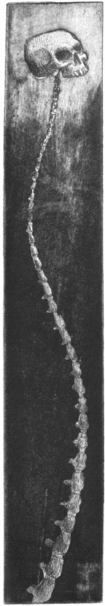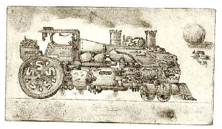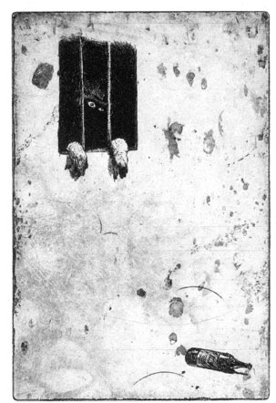 Seven Nightmares -- (1999) This was the first book I created using copper-plate etchings as illustrations. Presented here are the eight illustrations from the book (enlarged to better show detail) with accompanying text. The books were bound by screws in wooden covers hinged at the spine. There were only five copies made, after which I shellacked five of the copper plates and attached them to the covers. All of the text was hand-set (in 10-point type!) and printed on a VanDerCook manual printing press. Unfortunately, I cannot sell the books, but I can make prints of the swimming pool or kitchen table images. Skull and Spine #1 -- (1999) This was the first of many images I made which contained the skull with elongated spine. Dark, no? Order a print! Abstinence -- (2000) Beware the Insatiable Bonebiter -- (1998) One of my first softground etchings. |