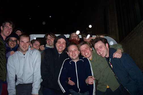 Death Cab For Cutie is Chris, Ben G., Nick, and Jason. The Velvet Teen is me, Judah, and Josh. The Thermals is Hutch, Kathy, Ben B., and Jordan. Merchandise and moral support is Lauren and Rob.